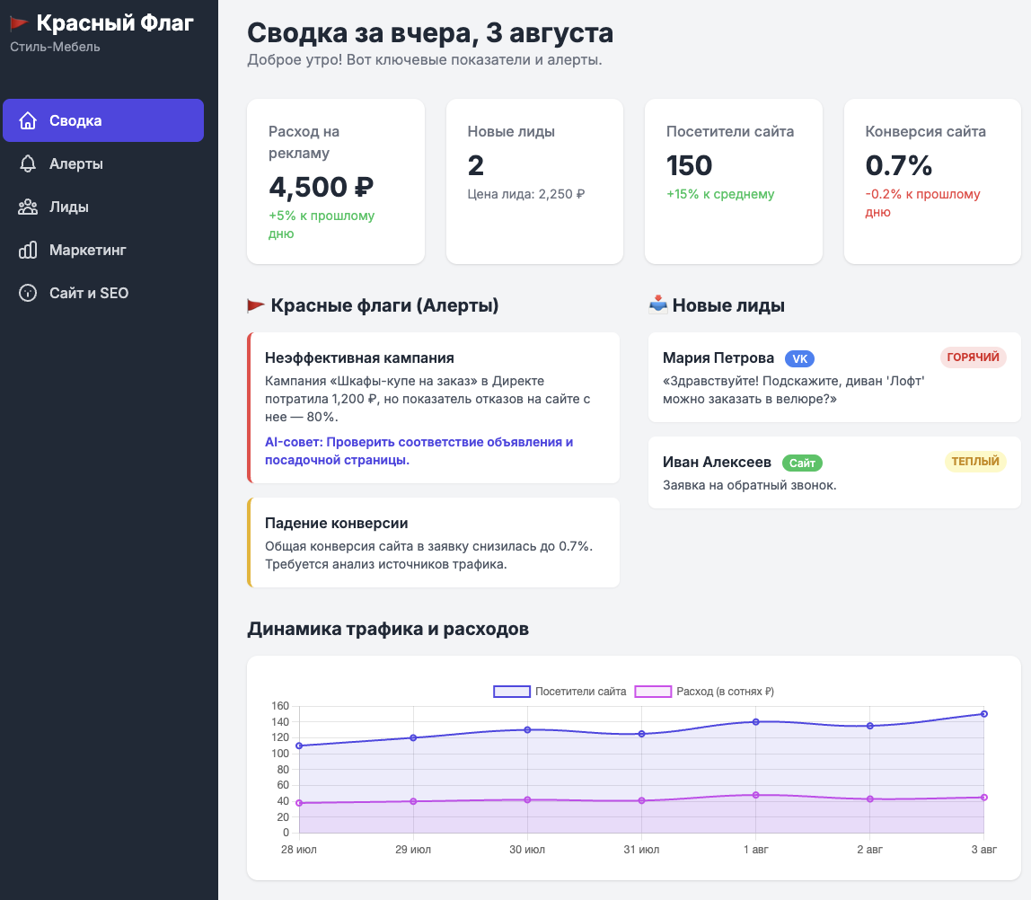 Для локального мебельного магазина, имеющего шоурум и онлайн-присутствие, мы внедрили AI-ассистента «Красный Флаг». Проект полностью автоматизировал сбор и анализ данных из всех ключевых маркетинговых каналов клиента. Владелец перестал вручную проверять десятки отчетов и получил единую утреннюю сводку с готовыми выводами и «красными флагами» — проблемами, требующими немедленного внимания.