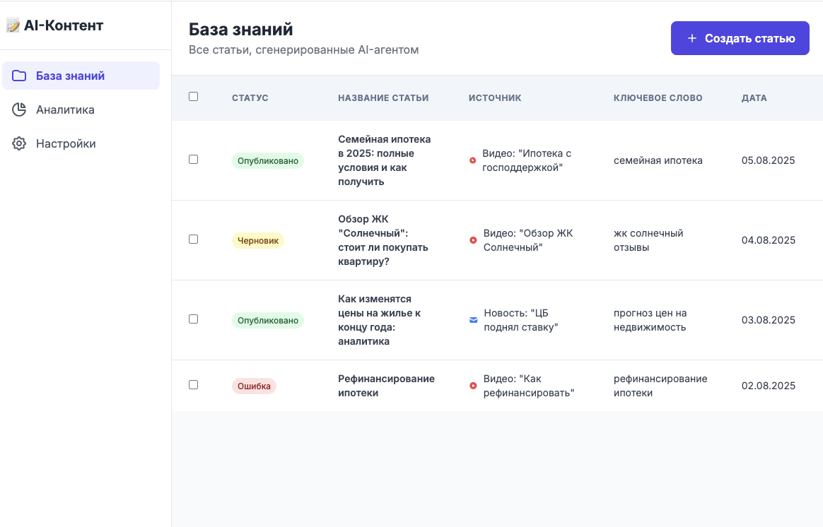 - Создание статьи: Генерирует уникальный, структурированный текст, грамотно вплетая ключевые слова и экспертные данные из источника (видео или новости).
